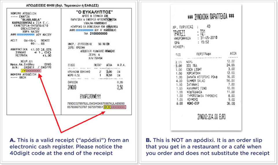 A campaign that aims to inform tourists in Greece about their consumer rights, the possibility to use a credit or prepaid credit card in their transactions and also encourages them to request a receipt for each transaction was initiated by the Independent Authority for Public Revenue (AADE). The campaign, in addition to a promotional banner (see image above), includes samples of both legal and illegal receipts (see pictures below) with explanatory comments as follows: