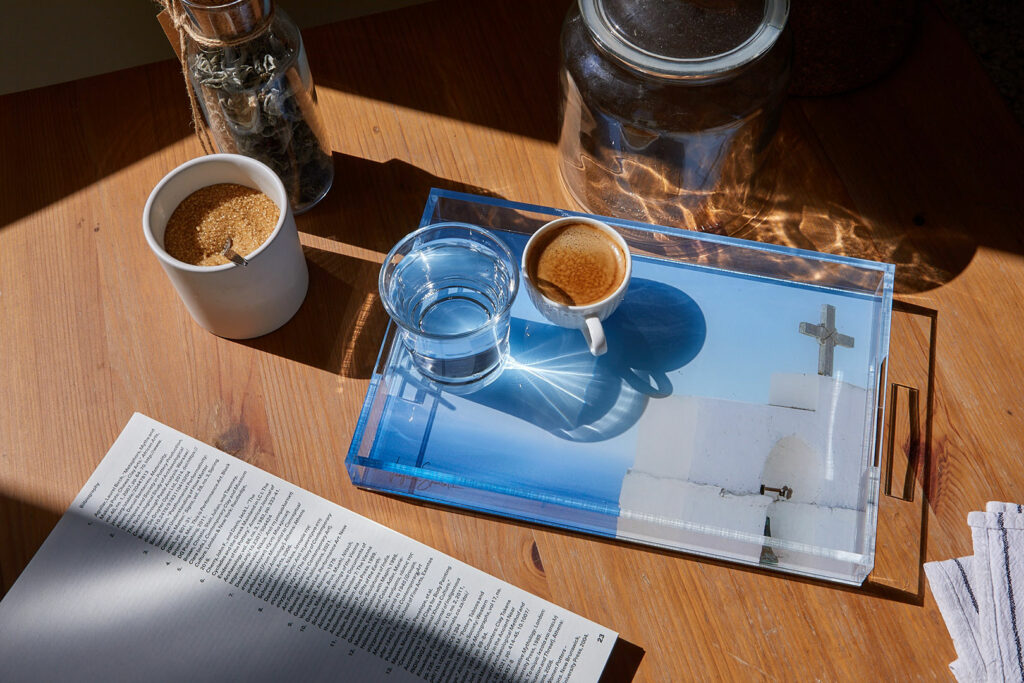 Inspired by the iconic landscapes of the Cyclades, artist Vangelis Spartalis has created a collection that highlights whitewashed houses, winding staircases, and deep blue seas – all brought to life through high-quality Giclee prints. The fine art prints are carefully produced on museum-quality Hahnemuhle paper, while the plexiglass items – press papier, trays, and keyrings – feature vibrant Giclee-printed images that play with light and transparency, making each piece feel like a window to the islands.