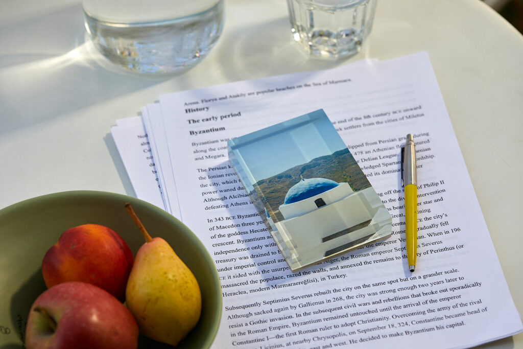 - Press Papier: Elegant plexiglass blocks featuring high-resolution Giclee prints (8x12x2.3 cm). A miniature piece of Cycladic charm for your desk.