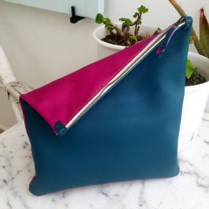 A stylish two-colored envelope bag with a metallic zipper crafted from genuine high-quality leather in fuchsia and dark blue color. 100% handstitched.