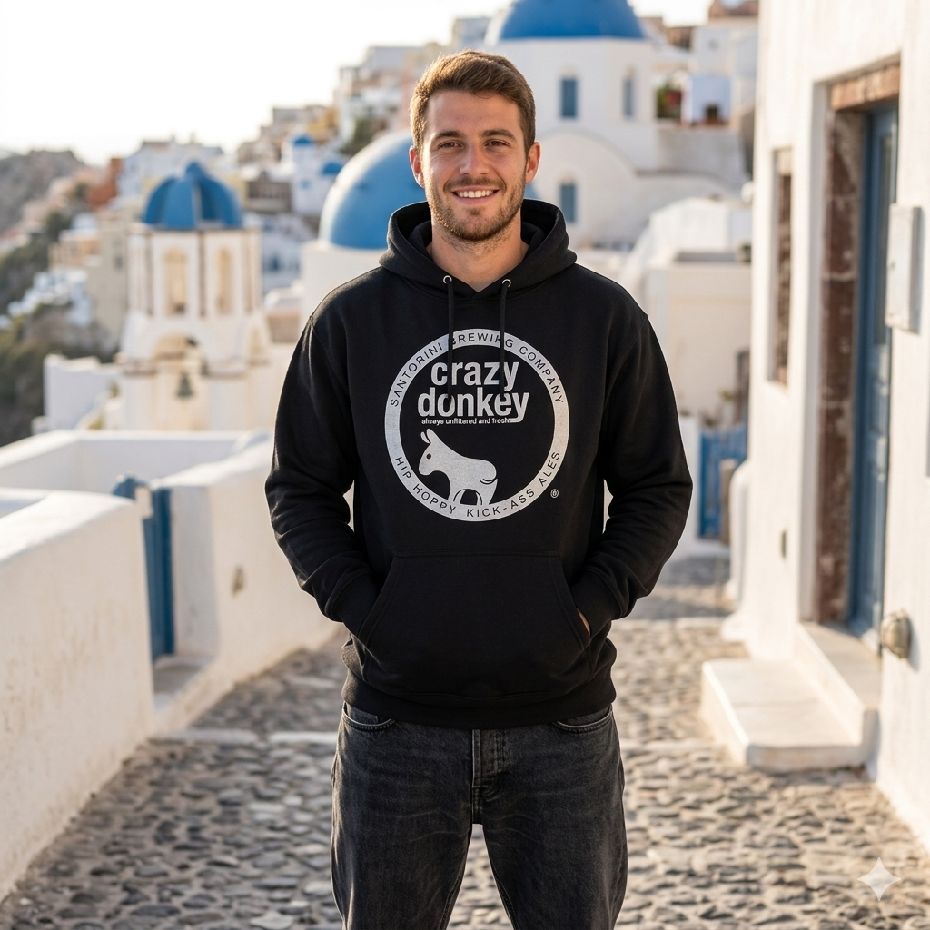 Adult hooded sweatshirt displaying the Crazy Donkey fresh beer logo