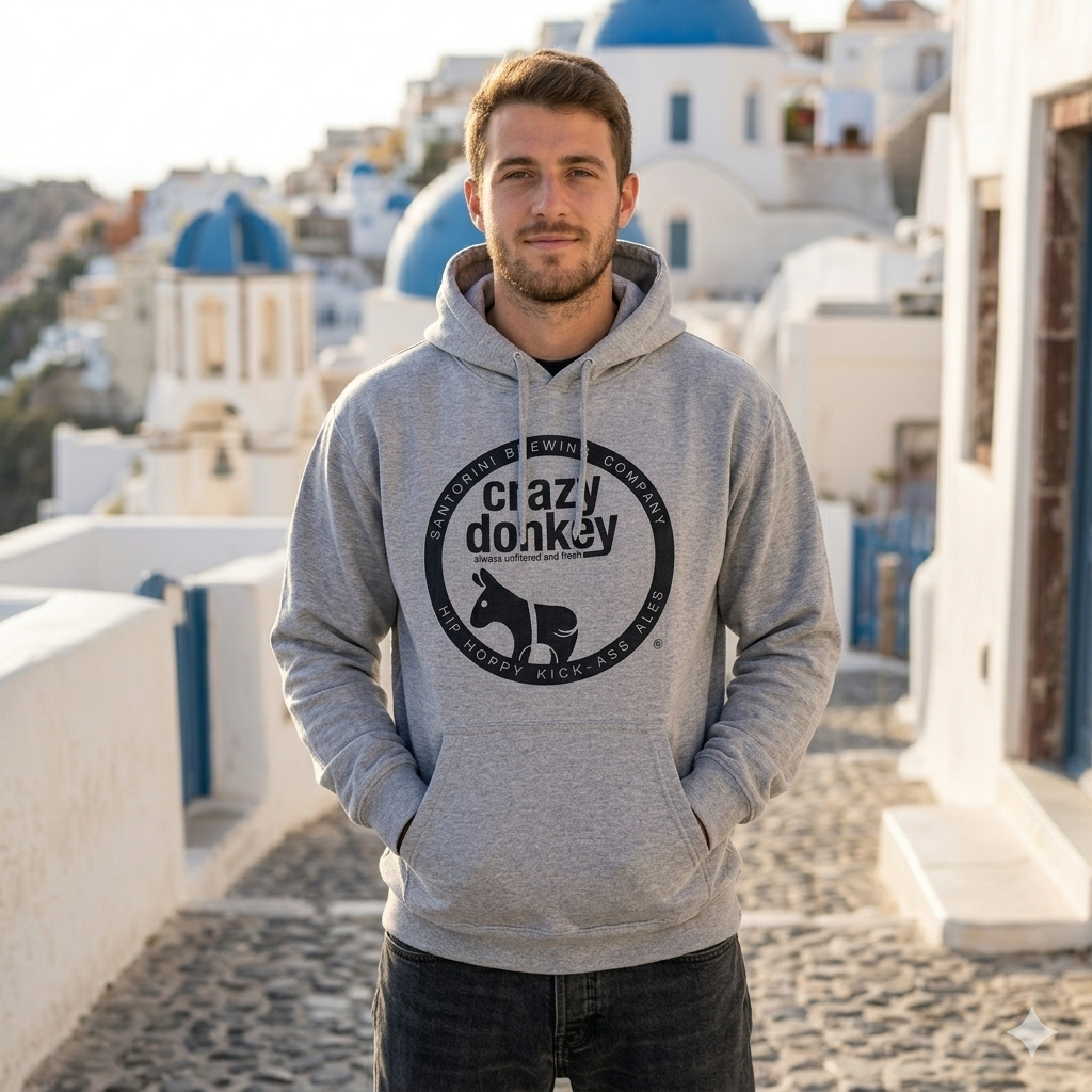 Adult hooded sweatshirt displaying the Crazy Donkey fresh beer logo